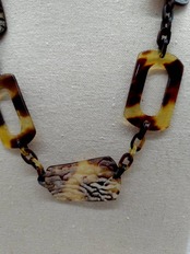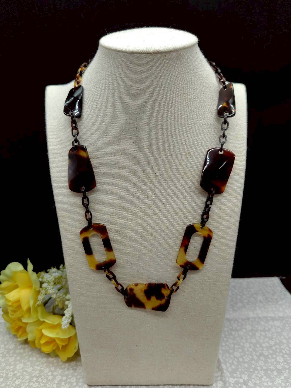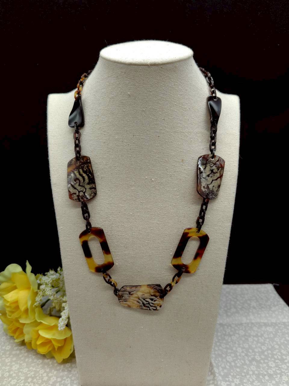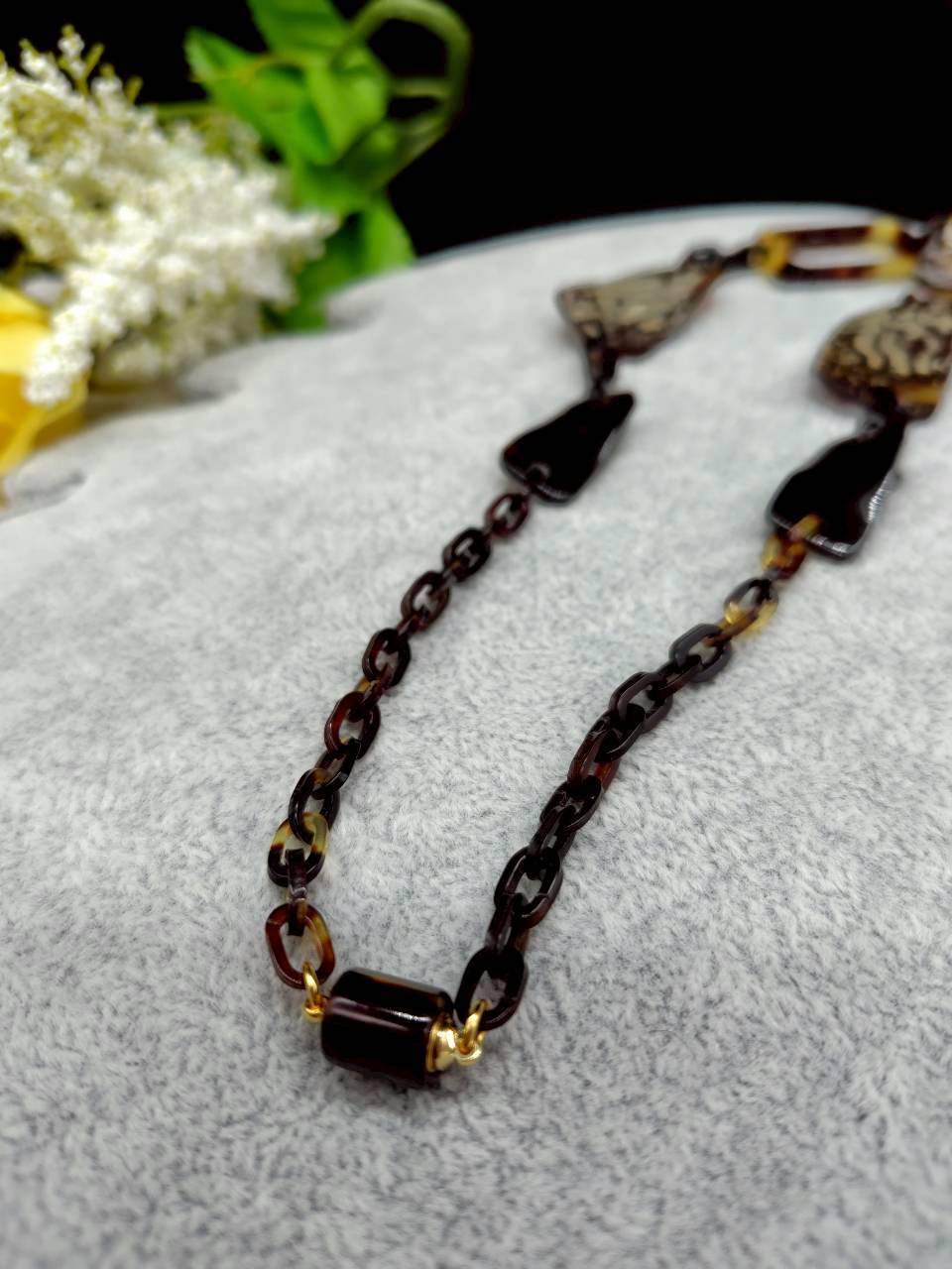 このネックレスは天然水杢茨布を使用した長方形の組み合わせが特長です。長方形の形状がもたらす独自のスタイルは、シンプルでありながら強いインパクトを与えます。