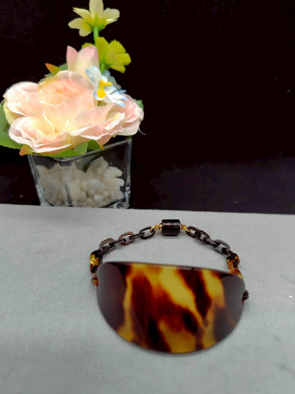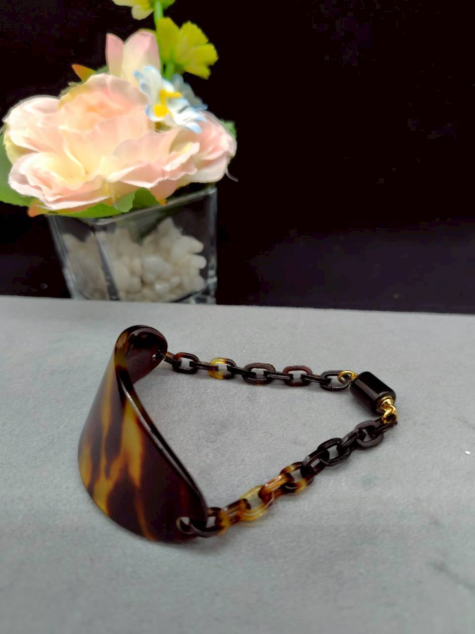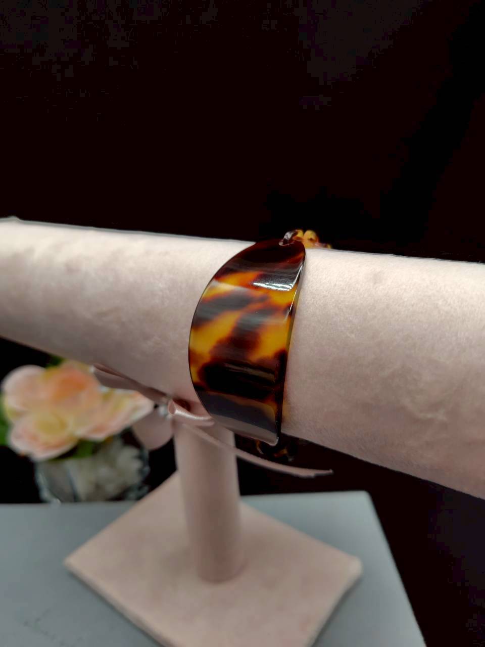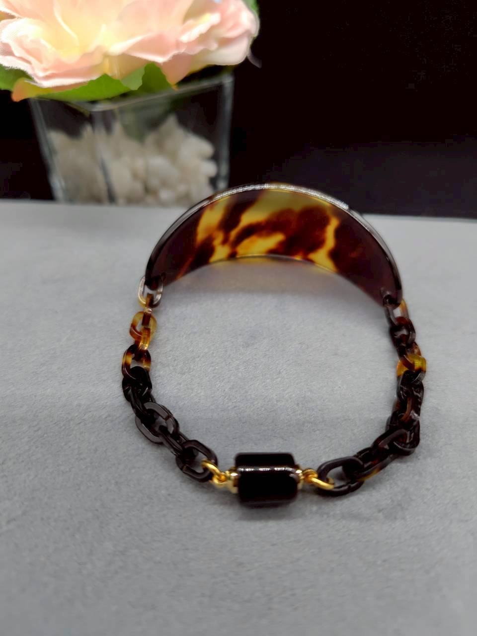 このブレスレットは小判型のデザインが特徴です。本べっ甲の美しい光沢と茨布の滑らかな質感が見事に調和し、身に着ける人の魅力を引き立てます。