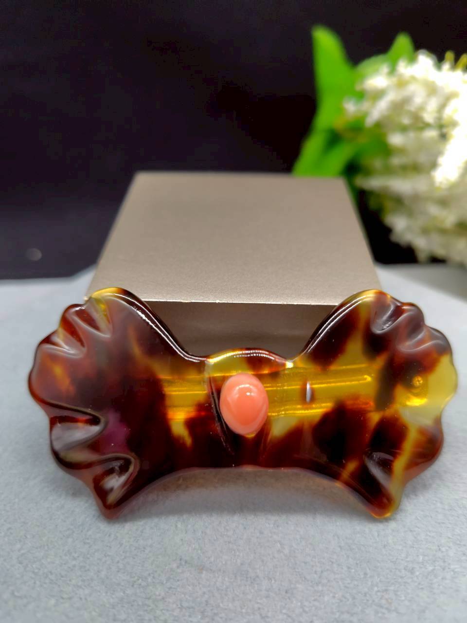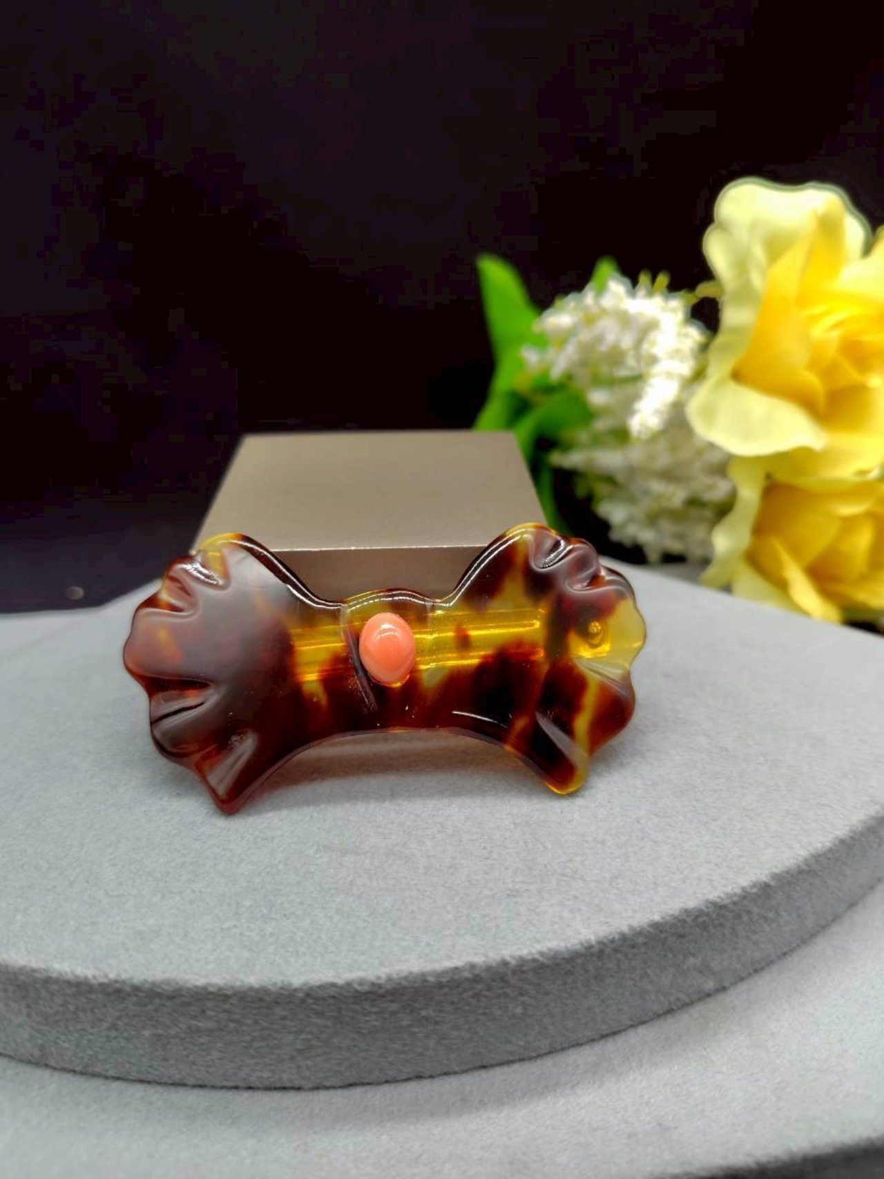 この髪留めはサンゴを使用した美しいデザインが特徴です。優雅なイチョウ型にサンゴが乗せられ洗練された印象を与えつつ、存在感を際立たせています。