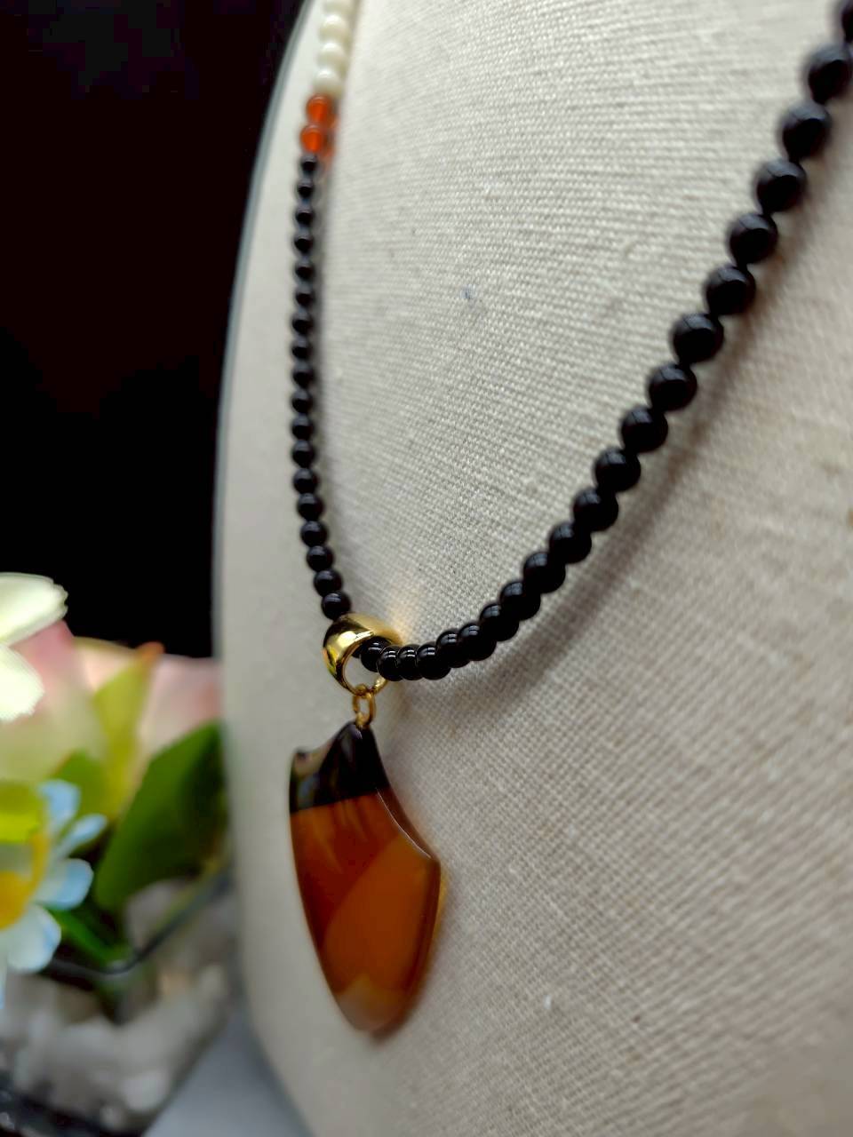 三色次分けデザインのペンダントは、独特の温かみと深みを持ち、あなたのスタイルに洗練された印象をプラスします。付属のオニキスネックレスがシンプルながらもアクセントを加え、カジュアルな日常使いからおしゃれなイベントまで幅広くお楽しみいただけます。